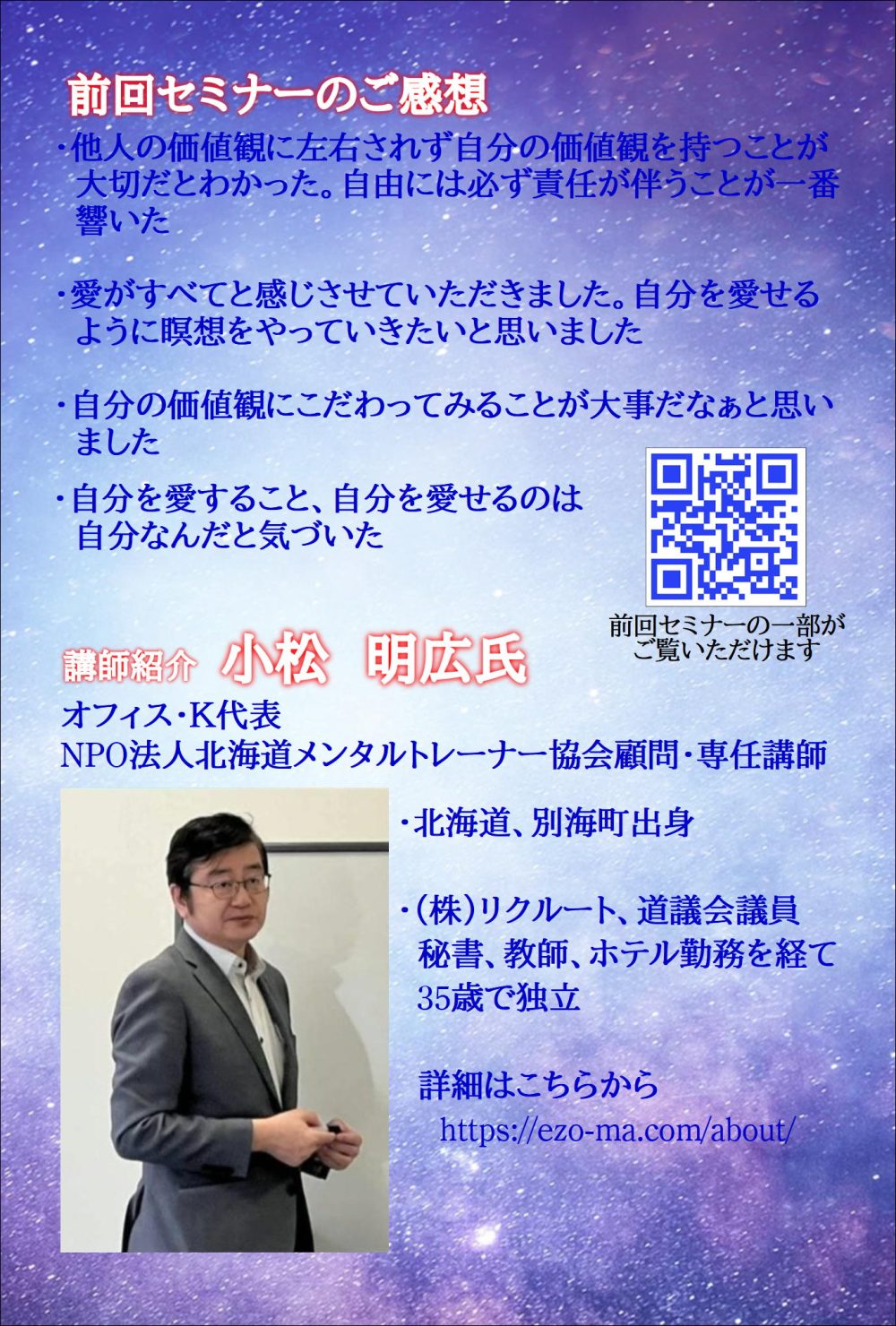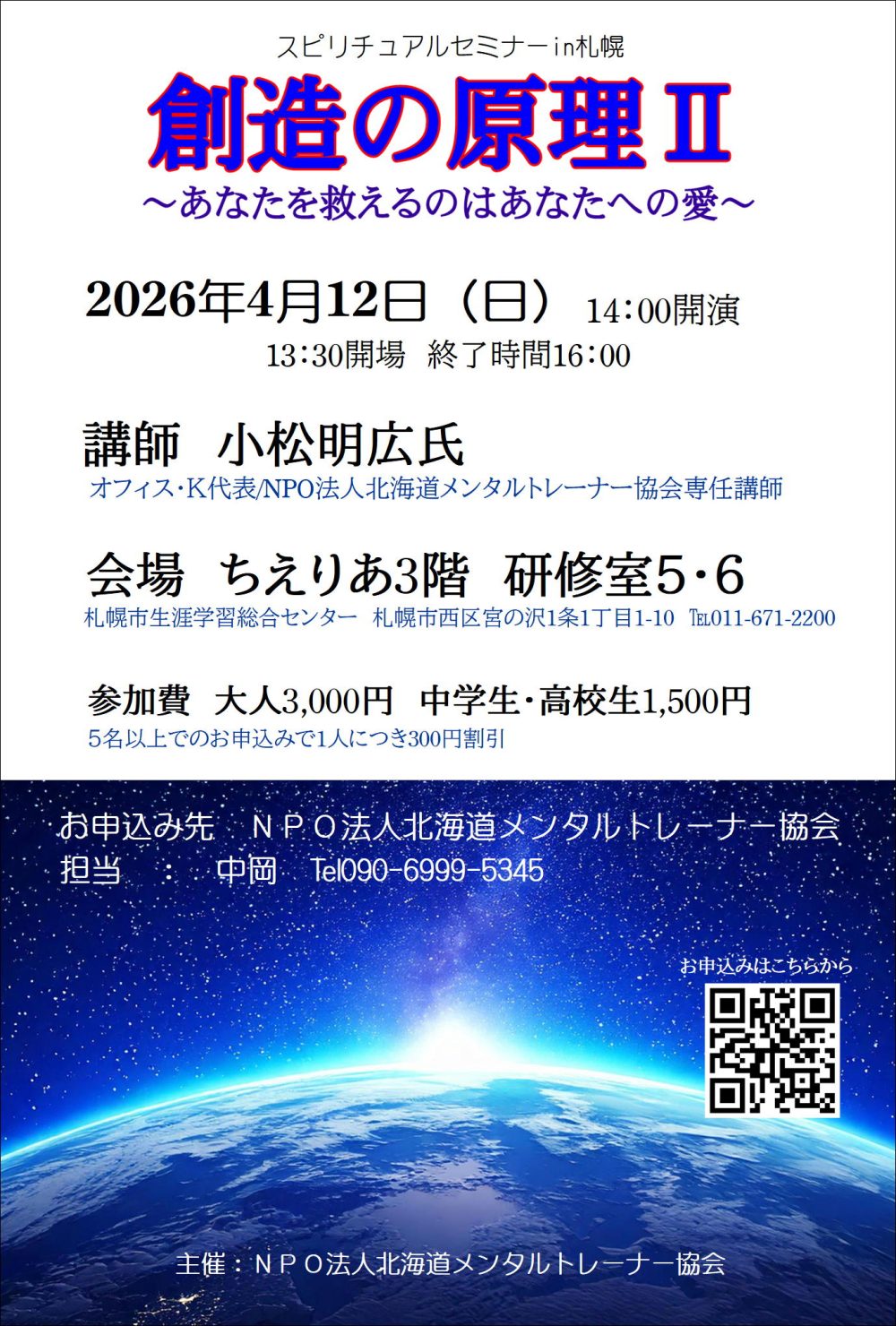 自分の人生を思い通りに創造していきましょう。たくさんの方のご参加をお待ちしています。